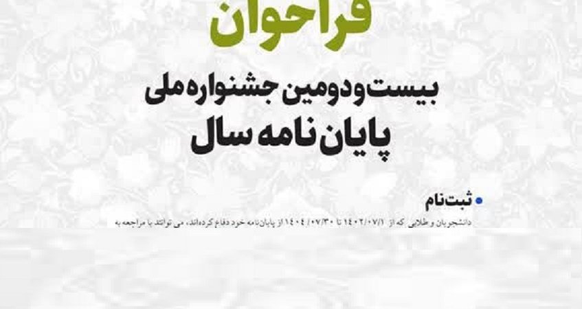 دانشجویانی که در بازه زمانی ۱۴۰۲/۷/۱ تا ۱۴۰۴/۶/۳۱ از پایاننامه خود در مقاطع تحصیلات تکمیلی دفاع کردهاند، میتوانند تا ۳۱ فروردین ۱۴۰۵ آثار خود را به دبيرخانه جشنواره ملی پایان نامه سال ارسال كنند.
