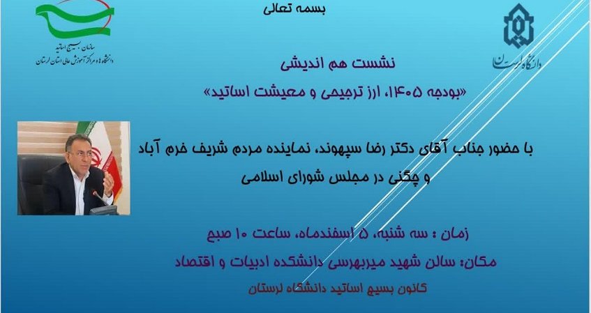 با حضور دکتر رضا سپهوند، نماینده مردم خرمآباد و چگنی در مجلس شورای اسلامی، نشست هماندیشی اساتید دانشگاه لرستان با موضوعات بودجه سال 1405، ارز ترجیحی و معیشت اساتید، برگزار میشود.